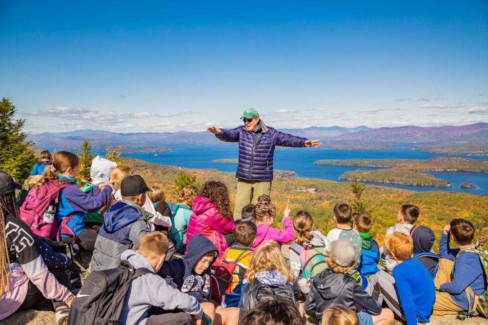 Volunteers point out the peaks and islands and towns around Lake Winnipesaukee and can talk more about the concepts shared at school and answer student (and chaperone or teacher) questions about their hike.