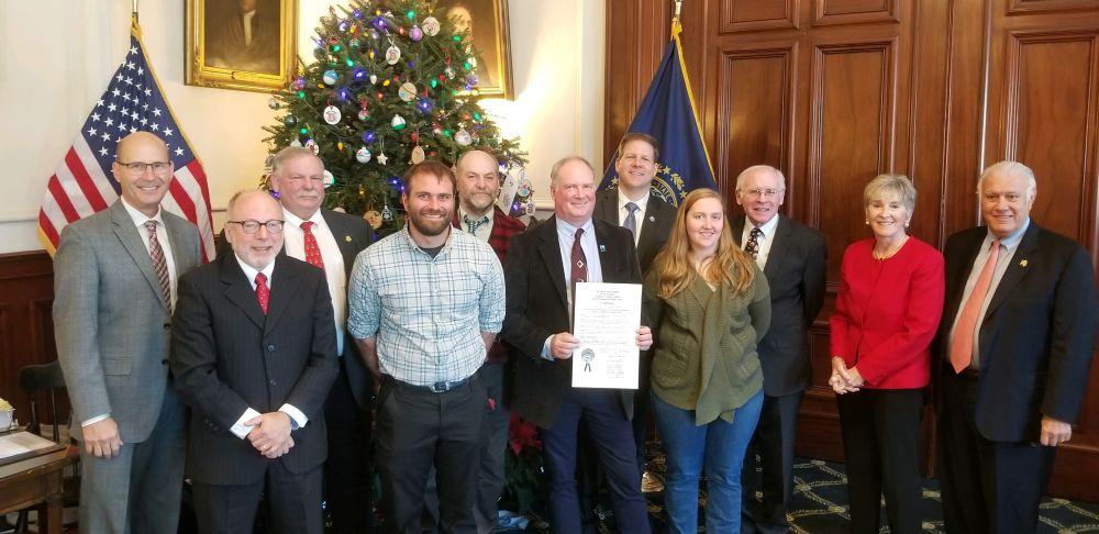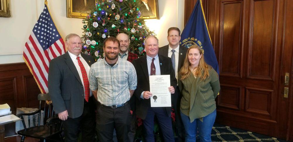 His Excellency, NH Governor Christopher T. Sununu and Honorable Members of the NH Executive Council gathered in Council chambers to accept with gratitude a donation of two official state holiday trees to grace the offices of the NH Statehouse. The trees were raised and cared for at the Forest Society's 1,400 acre Rocks Christmas Tree Farm in Bethlehem.