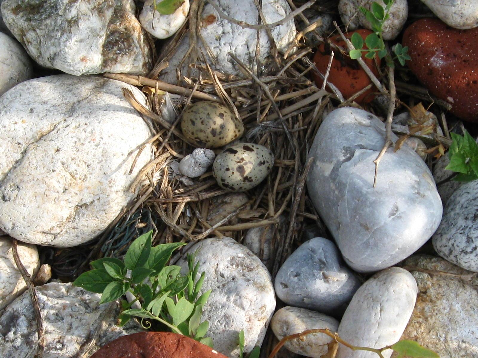 But that's one of the jobs she's charged with. And today, "monitoring" means banding. But, before we enter the breeding area - where all the chicks are - Liz pauses to provide us with some useful equipment: hats. The wide-brimmed straw hats she pulls out of a cardboard box, will protect us from the terns’ sharp beaks. Adults will hover and dive, and administer a sharp peck on the scalp, to deter intruders too close to their nests. And my rain jacket keeps airborne tern poop off my clothes. Now suited up, Liz relays the rules for walking among ground-nesting birds.