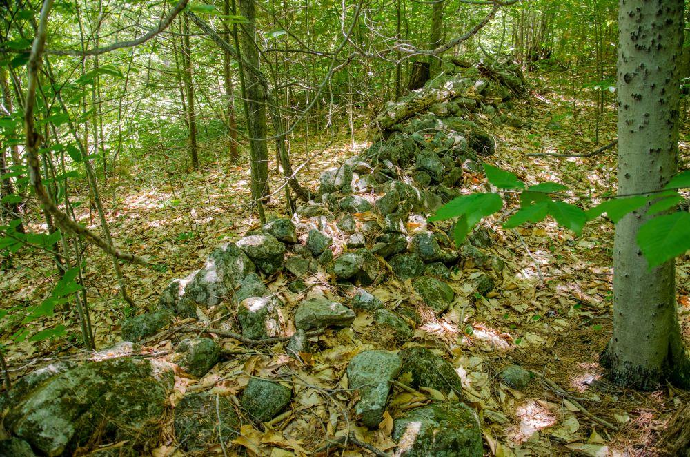 Interior forests contain American beech trees - the photo shows a beech tree pocked by scale and a stone wall near a site where small stones had been removed for agricultural use as tillage in long-abandoned fields of a farm in the former neighborhood of New Portsmouth.