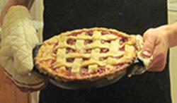 Preheat oven to 425 degrees. Cut ball of dough in half, roll out one half into a circle about 1/8-inch thick, adding flour to the board/pin/dough if sticky. Place in pie plate. Mix filling in bowl; if runny juice accumulates in bottom of bowl, stir a tablesppon or so of f lour into the mixture. Pour filling into pie plate. Roll out second half of dough and place on top of filling or cut into ½-inch strips and place over filling in a lattice pattern. Trim all but ½ and inch of surplus dough from pie plate rim. Crimp doug together along pie plate edge with fork. Poke 6-12 holes in top crust (if not lattice) with fork. Place on a cookie sheet and insert into center rack of oven. Bake for 20 minutes at 425, then 25 minutes more at 400 degrees. Pie is done when juice oozes out the top crust and begins to run onto the cookie sheet. If the crust is getting too brown in one or more places before the rest is done, place a small piece of aluminum foil over that spot to stop further browning.
