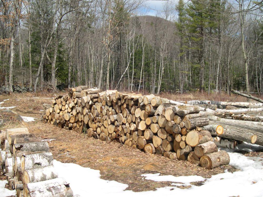 Dry hardwood logs in the firewood pile include red oak, white ash, beech and white birch. All are excellent firewood for winter heating when properly seasoned.