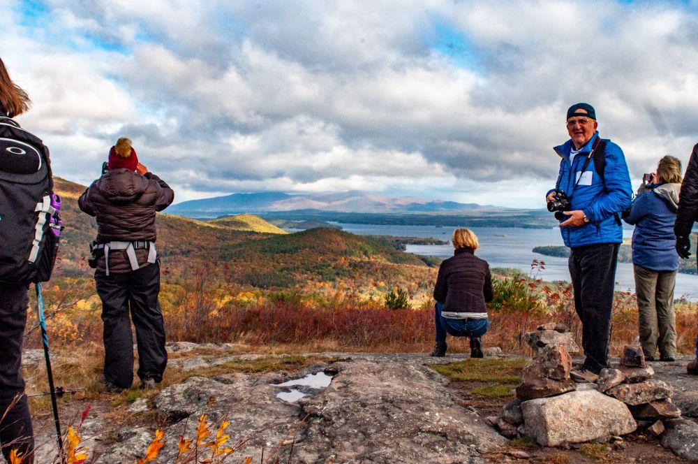 Hikers enjoy the view of Belknap Range and Lake Winnipesaukee from Forest Society Morse Preserve in Alton