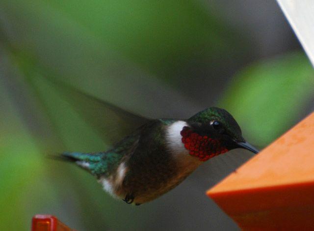 Ruby-throated Hummingbirds are the only breeding hummingbird in the Northeast. The species occupies the largest breeding range of any North American hummingbird. Ruby-throated Hummingbirds beat their wings 53 times per second. While it is an extremely agile flyer, its short legs prevent it from walking or hopping. Males do not remain with females for long. Breeding pairs remain together for courtship and mating which generally lasts several days to several weeks. Adults begin their fall migration south by early August.