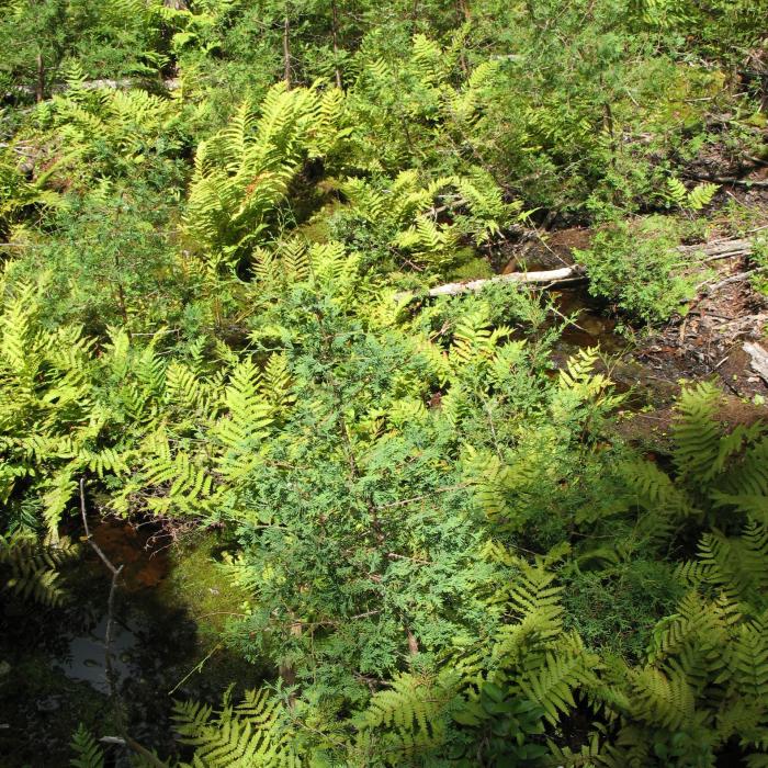 A short trail skirts the edge of an Atlantic White Cedar Basin Swamp, which is a rare natural community. This community features very slow-growing cedar trees adapted to wet conditions and an assemblage of uncommon plants that depend on just this particular habitat to survive.
