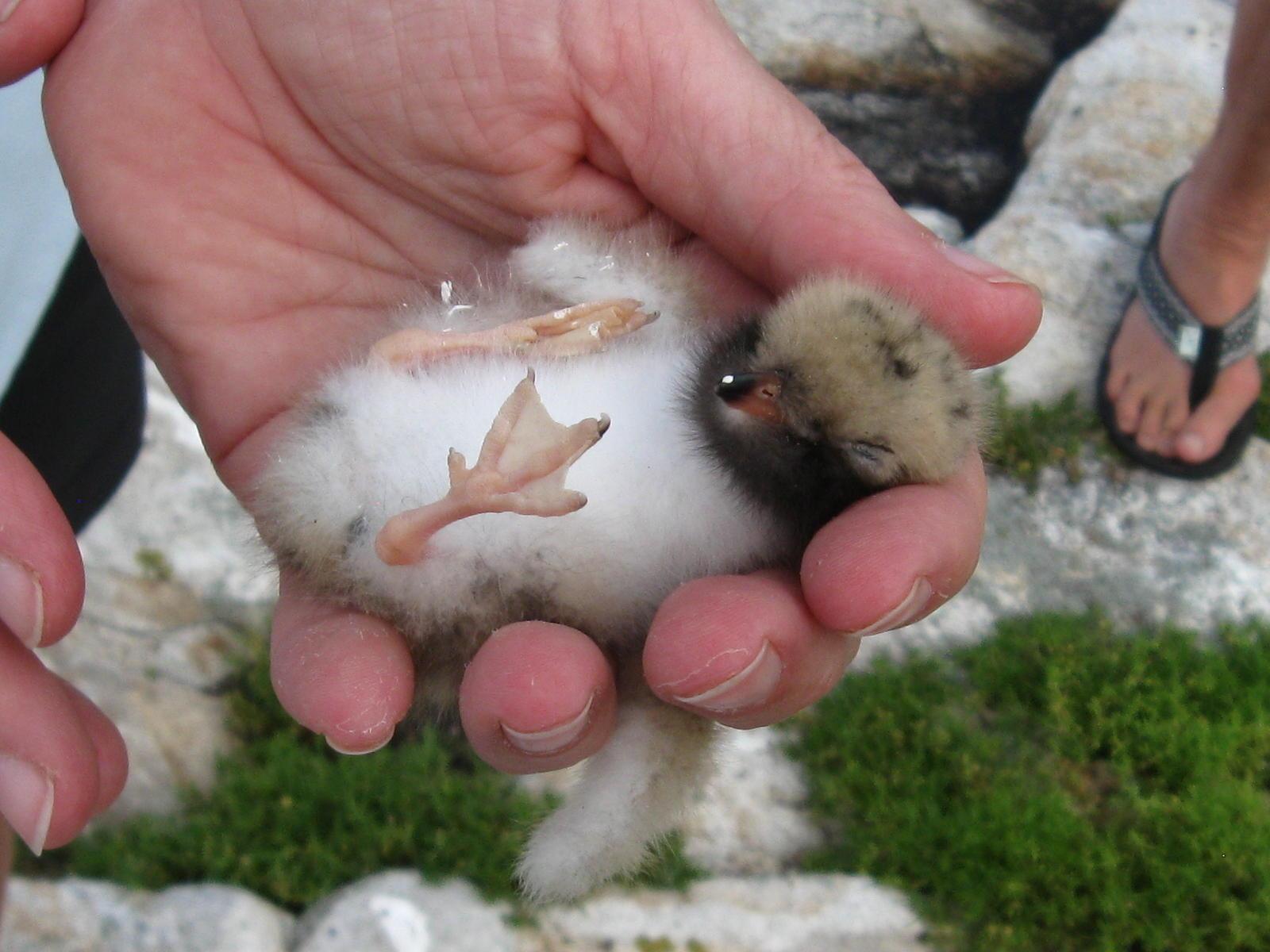 In the midst of all this, Liz bends down and picks up one of the scampering camouflaged chicks. Cradling the living puffball in her hand, she begins taking its vitals, before coaching a volunteer through the banding process. Over the course of the summer, Liz and her team banded 240 tern chicks. These tiny ID bracelets are one way that biologists across the region know where terns go, how long they live and whether they will return to nest on these same islands in years to come.