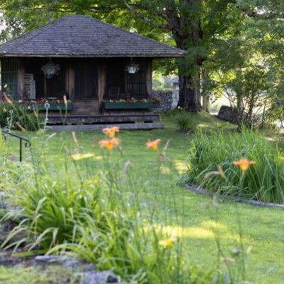 Then: A unique building on the estate was the Log Cabin Playhouse, or Fanny's little house, built in 1886. She spent many hours there playing, baking and jarring jellies. Originally located on the hill near the big house, Fannie had it moved down behind the cottage.