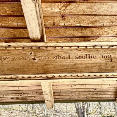 Now: You can see the beehouse on the self-guided history tour of the property, including intricate carvings of flora motifs and whimsical sayings, many having to do with bees, like this one which says "A bee hive's hum shall soothe my ear."